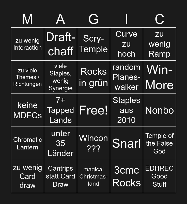This bingo card has a free space and 24 words: unter 35 Länder, Cantrips statt Card Draw, Rocks in grün, zu wenig Card draw, zu wenig Ramp, zu wenig Interaction, zu viele Themes / Richtungen, Draft-chaff, Staples aus 2010, Wincon ???, random Planes-walker, keine MDFCs, Snarl, Temple of the False God, viele Staples, wenig Synergie, 3cmc Rocks, Nonbo, Scry-Temple, Win-More, 7+ Tapped Lands, EDHREC Good Stuff, Chromatic Lantern, Curve zu hoch and magical Christmas- land.