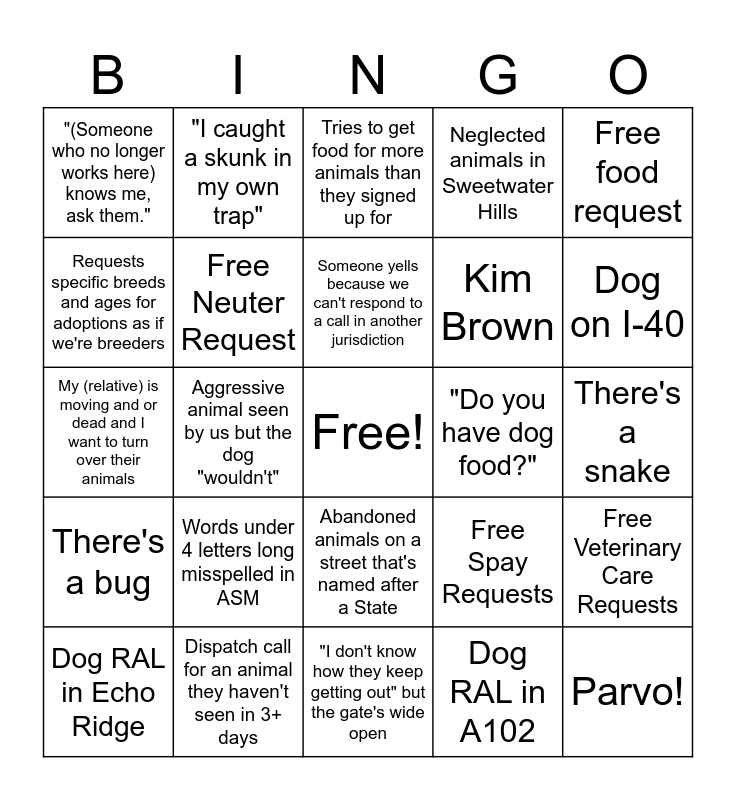 This bingo card has a free space and 24 words: Words under 4 letters long misspelled in ASM, Dispatch call for an animal they haven't seen in 3+ days, Someone yells because we can't respond to a call in another jurisdiction, Dog RAL in Echo Ridge, Free food request, "(Someone who no longer works here) knows me, ask them.", Requests specific breeds and ages for adoptions as if we're breeders, "I caught a skunk in my own trap", "Do you have dog food?", Abandoned animals on a street that's named after a State, Kim Brown, My (relative) is moving and or dead and I want to turn over their animals, Free Spay Requests, Free Veterinary Care Requests, Free Neuter Request, Dog RAL in A102, There's a snake, Tries to get food for more animals than they signed up for, Dog on I-40, Aggressive animal seen by us but the dog "wouldn't", Parvo!, There's a bug, Neglected animals in Sweetwater Hills and "I don't know how they keep getting out" but the gate's wide open.