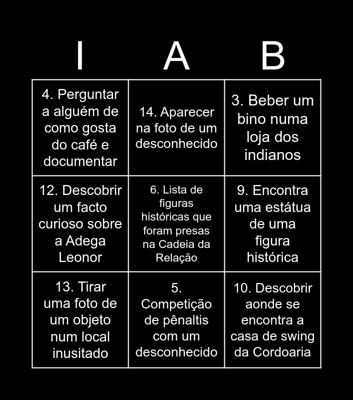 This bingo card has 15 words: 1. Contar o número de bancos do jardim do Palácio de Cristal, 2. Ajudar uma velhinha a atravessar a rua, 3. Beber um bino numa loja dos indianos, 4. Perguntar a alguém de como gosta do café e documentar, 5. Competição de pênaltis com um desconhecido, 6. Lista de figuras históricas que foram presas na Cadeia da Relação, 7. Tirar uma foto com a linguagem gestual da Câmara do Porto, 8. Foto de grupo no ICBAS, 9. Encontra uma estátua de uma figura histórica, 10. Descobrir aonde se encontra a casa de swing da Cordoaria, 11. Dar de comer a um pavão, 12. Descobrir um facto curioso sobre a Adega Leonor, 13. Tirar uma foto de um objeto num local inusitado, 14. Aparecer na foto de um desconhecido and 15. Dançar ao malhão com um trolha.