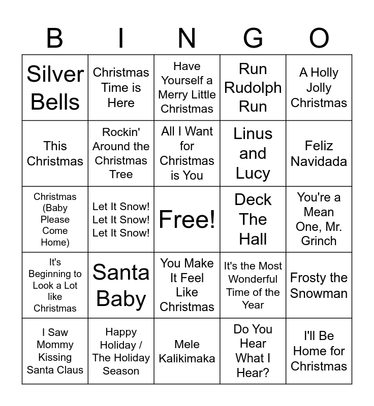This bingo card has a free space and 36 words: Up on the Housetop, Merry, Christmas, Happy Holidays, Jingle Bell Rock, Rockin' Around the Christmas Tree, It's the Most Wonderful Time of the Year, It's Beginning to Look a Lot like Christmas, All I Want for Christmas is You, Last Christmas, A Holly Jolly Christmas, Underneath the Tree, Let It Snow! Let It Snow! Let It Snow!, Run Rudolph Run, Santa Tell Me, Deck The Hall, Feliz Navidada, Silver Bells, Here Comes Santa Claus, Santa Baby, I'll Be Home for Christmas, Have Yourself a Merry Little Christmas, You're a Mean One, Mr. Grinch, Frosty the Snowman, Happy Holiday / The Holiday Season, I Saw Mommy Kissing Santa Claus, Mele Kalikimaka, Christmas Time is Here, Christmas (Baby Please Come Home), Santa Claus Is Coming to Town, Linus and Lucy, This Christmas, I Want a Hippopotamus For Christmas, Sleigh Ride, Do You Hear What I Hear?, You Make It Feel Like Christmas, Hallelujah and Mistletoe.