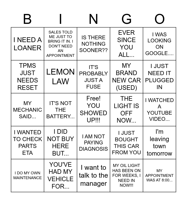 This bingo card has a free space and 24 words: I DID NOT BUY HERE BUT..., YOU'VE HAD MY VEHICLE FOR..., IT'S PROBABLY JUST A FUSE, I DO MY OWN MAINTENANCE, I WAS LOOKING ON GOOGLE...., I NEED A LOANER, TPMS JUST NEEDS RESET, SALES TOLD ME JUST TO BRING IT IN. I DON'T NEED AN APPOINTMENT, THE LIGHT IS OFF NOW..., I AM NOT PAYING DIAGNOSIS, MY BRAND NEW CAR (USED), MY MECHANIC SAID..., I JUST BOUGHT THIS CAR FROM YOU, I'm leaving town tomorrow, LEMON LAW, MY OIL LIGHT HAS BEEN ON FOR WEEKS, I NEED IN NOW!!!, I WATCHED A YOUTUBE VIDEO..., IS THERE NOTHING SOONER??, I JUST NEED IT PLUGGED IN, IT'S NOT THE BATTERY..., MY APPOINTMENT WAS AT 8:00..., I WANTED TO CHECK PARTS ETA, EVER SINCE YOU ALL... and I want to talk to the manager.