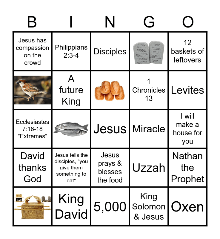 This bingo card has 5 images, a free space and 19 words: Jesus tells the disciples, "you give them something to eat", King Solomon & Jesus, 12 baskets of leftovers, Jesus has compassion on the crowd, Philippians 2:3-4, Disciples, Miracle, I will make a house for you, Ecclesiastes 7:16-18 "Extremes", A future King, Uzzah, Nathan the Prophet, King David, 5,000, Levites, David thanks God, Jesus prays & blesses the food, 1 Chronicles 13 and Oxen.