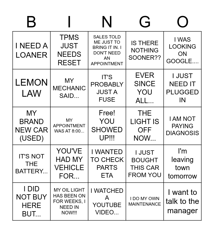 This bingo card has a free space and 24 words: I DID NOT BUY HERE BUT..., YOU'VE HAD MY VEHICLE FOR..., IT'S PROBABLY JUST A FUSE, I DO MY OWN MAINTENANCE, I WAS LOOKING ON GOOGLE...., I NEED A LOANER, TPMS JUST NEEDS RESET, SALES TOLD ME JUST TO BRING IT IN. I DON'T NEED AN APPOINTMENT, THE LIGHT IS OFF NOW..., I AM NOT PAYING DIAGNOSIS, MY BRAND NEW CAR (USED), MY MECHANIC SAID..., I JUST BOUGHT THIS CAR FROM YOU, I'm leaving town tomorrow, LEMON LAW, MY OIL LIGHT HAS BEEN ON FOR WEEKS, I NEED IN NOW!!!, I WATCHED A YOUTUBE VIDEO..., IS THERE NOTHING SOONER??, I JUST NEED IT PLUGGED IN, IT'S NOT THE BATTERY..., MY APPOINTMENT WAS AT 8:00..., I WANTED TO CHECK PARTS ETA, EVER SINCE YOU ALL... and I want to talk to the manager.