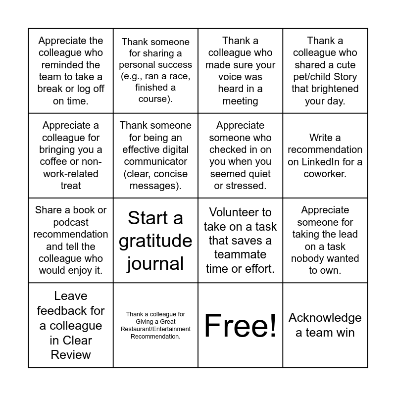 This bingo card has 16 words: Thank a colleague for Giving a Great Restaurant/Entertainment Recommendation., Appreciate someone for taking the lead on a task nobody wanted to own., Thank a colleague who made sure your voice was heard in a meeting, Appreciate the colleague who reminded the team to take a break or log off on time., Share a book or podcast recommendation and tell the colleague who would enjoy it., Thank someone for sharing a personal success (e.g., ran a race, finished a course)., Volunteer to take on a task that saves a teammate time or effort., Free!, Appreciate a colleague for bringing you a coffee or non-work-related treat, Thank someone for being an effective digital communicator (clear, concise messages)., Leave feedback for a colleague in Clear Review, Thank a colleague who shared a cute pet/child Story that brightened your day., Start a gratitude journal, Write a recommendation on LinkedIn for a coworker., Appreciate someone who checked in on you when you seemed quiet or stressed. and Acknowledge a team win.