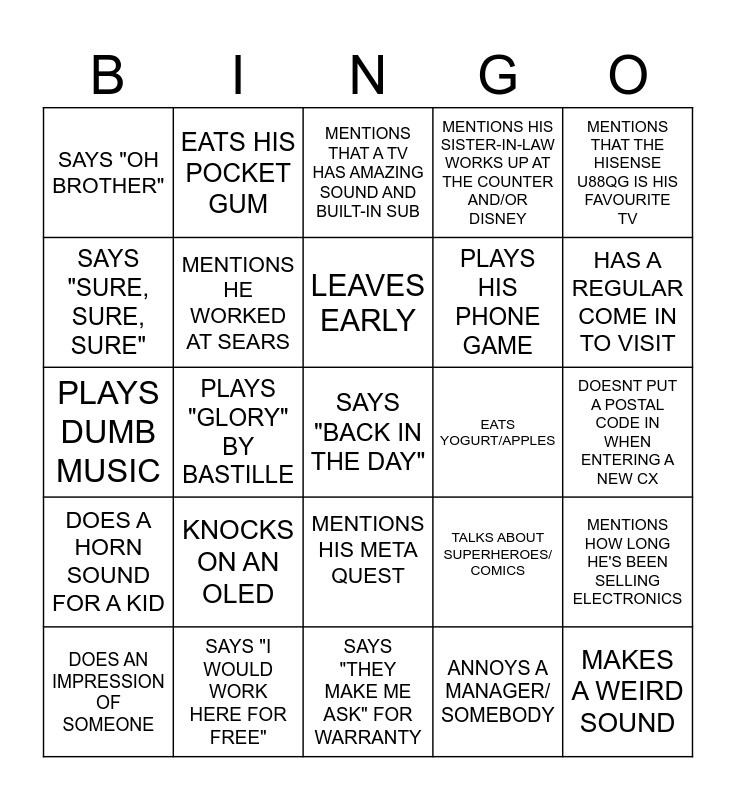 This bingo card has a free space and 24 words: KNOCKS ON AN OLED, SAYS "I WOULD WORK HERE FOR FREE", LEAVES EARLY, DOES AN IMPRESSION OF SOMEONE, MENTIONS THAT THE HISENSE U88QG IS HIS FAVOURITE TV, SAYS "OH BROTHER", SAYS "SURE, SURE, SURE", EATS HIS POCKET GUM, EATS YOGURT/APPLES, MENTIONS HIS META QUEST, PLAYS HIS PHONE GAME, PLAYS DUMB MUSIC, TALKS ABOUT SUPERHEROES/ COMICS, MENTIONS HOW LONG HE'S BEEN SELLING ELECTRONICS, MENTIONS HE WORKED AT SEARS, ANNOYS A MANAGER/ SOMEBODY, DOESNT PUT A POSTAL CODE IN WHEN ENTERING A NEW CX, MENTIONS THAT A TV HAS AMAZING SOUND AND BUILT-IN SUB, HAS A REGULAR COME IN TO VISIT, PLAYS "GLORY" BY BASTILLE, MAKES A WEIRD SOUND, DOES A HORN SOUND FOR A KID, MENTIONS HIS SISTER-IN-LAW WORKS UP AT THE COUNTER AND/OR DISNEY and SAYS "THEY MAKE ME ASK" FOR WARRANTY.