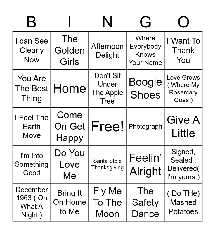 This bingo card has a free space and 68 words: GREENS BEANS POTATOES, ( Do THe) Mashed Potatoes, Thanksgiving Theme, With A Little Help From My Friends, Apple, Peaches , Pumpkin Pie, Cheeseburger In Paradise, The Golden Girls, We Are Family, Don't Sit Under The Apple Tree, Lets Turkey Trot, Santa Stole Thanksgiving, What A Wonderful World, Give A Little, I Want To Thank You, Memories, You Are The Best Thing, Come On Get Happy, I can See Clearly Now, Good Day Sunshine, Do You Love Me, Boogie Shoes, Feelin’ Alright, I'm Into Something Good, Linus And Lucy, Me And Julio Down By The Schoolyard, I Got You Babe, Kokomo, Cecilia, Signed, Sealed , Delivered( I’m yours ), You Make My Dreams ( Come Trues), Afternoon Delight, Lean On Me, Ain't No Mountain High Enough, Wouldn't It Be Nice, Where Everybody Knows Your Name, If You Wanna Be Happy, Stretchy Pants, December 1963 ( Oh What A Night ), Love Grows ( Where My Rosemary Goes ), I Feel The Earth Move, I'll Be There For You, thank u , next, Home, Turkey Chase, Lovely Day, You're My Best Friend, Count on Me, Friends In Low Places, Photograph, Bring It On Home to Me, Rich Girl, Thank you ( Falettinme Be Mice Elf Agin), Every Breath You Take, Fly Me To The Moon, You Know Im No Good, For Once In My Life, The Safety Dance, Cake By The Ocean, Jumpin’ Jack Flash, Escape ( The Pina Colada Song ), American Pie, Born To Run, Maybelline, Gratitude, Piano Man, Best Of My Love, Got To Get You Into My Life and Where You Lead.