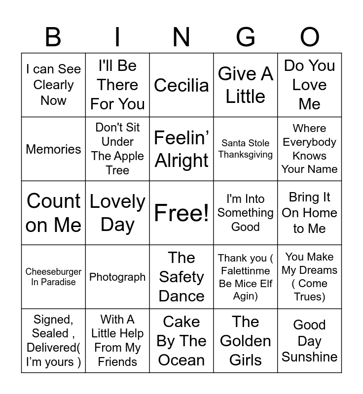 This bingo card has a free space and 61 words: Thanksgiving Theme, With A Little Help From My Friends, Apple, Peaches , Pumpkin Pie, Cheeseburger In Paradise, The Golden Girls, We Are Family, Don't Sit Under The Apple Tree, Lets Turkey Trot, Santa Stole Thanksgiving, What A Wonderful World, Give A Little, I Want To Thank You, Memories, You Are The Best Thing, Come On Get Happy, I can See Clearly Now, Good Day Sunshine, Do You Love Me, Boogie Shoes, Feelin’ Alright, I'm Into Something Good, Cecilia, Signed, Sealed , Delivered( I’m yours ), You Make My Dreams ( Come Trues), Afternoon Delight, Lean On Me, Ain't No Mountain High Enough, Wouldn't It Be Nice, Where Everybody Knows Your Name, If You Wanna Be Happy, Stretchy Pants, December 1963 ( Oh What A Night ), Love Grows ( Where My Rosemary Goes ), I Feel The Earth Move, I'll Be There For You, thank u , next, Home, Lovely Day, You're My Best Friend, Count on Me, Friends In Low Places, Photograph, Bring It On Home to Me, Rich Girl, Thank you ( Falettinme Be Mice Elf Agin), Every Breath You Take, Fly Me To The Moon, You Know Im No Good, For Once In My Life, The Safety Dance, Cake By The Ocean, Jumpin’ Jack Flash, Escape ( The Pina Colada Song ), American Pie, Born To Run, Maybelline, Gratitude, Piano Man, Best Of My Love, Got To Get You Into My Life and Where You Lead.