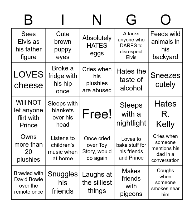 This bingo card has a free space and 24 words: Brawled with David Bowie over the remote once, Listens to children’s music when at home, Cries when his plushies are abused, Makes friends with pigeons, Feeds wild animals in his backyard, Sees Elvis as his father figure, Cute brown puppy eyes, Absolutely HATES eggs, Sleeps with a nightlight, Hates R. Kelly, Will NOT let anyone flirt with Prince, Broke a fridge with his hip once, Loves to bake stuff for his friends and Prince, Cries when someone mentions his dad in a conversation, LOVES cheese, Snuggles his friends, Laughs at the silliest things, Attacks anyone who DARES to disrespect Elvis, Sneezes cutely, Owns more than 20 plushies, Sleeps with blankets over his head, Once cried over Toy Story, would do again, Hates the taste of alcohol and Coughs when someone smokes near him.