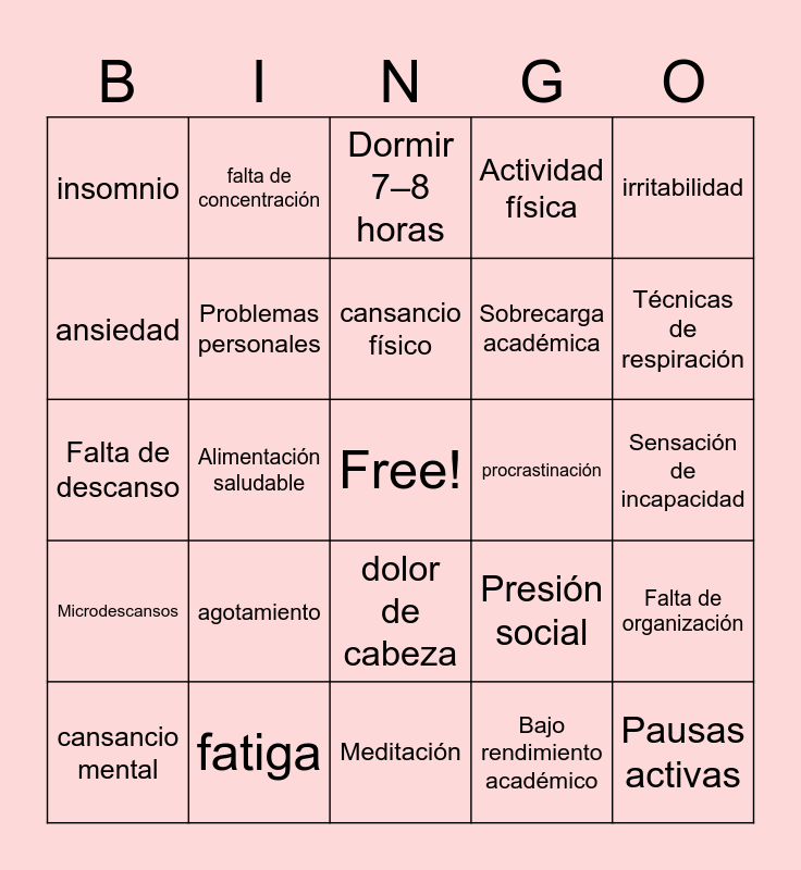 This bingo card has a free space and 24 words: agotamiento, fatiga, cansancio físico, cansancio mental, irritabilidad, insomnio, ansiedad, falta de concentración, procrastinación, dolor de cabeza, Sobrecarga académica, Falta de descanso, Presión social, Falta de organización, Problemas personales, Bajo rendimiento académico, Sensación de incapacidad, Dormir 7–8 horas, Técnicas de respiración, Alimentación saludable, Pausas activas, Microdescansos, Actividad física and Meditación.