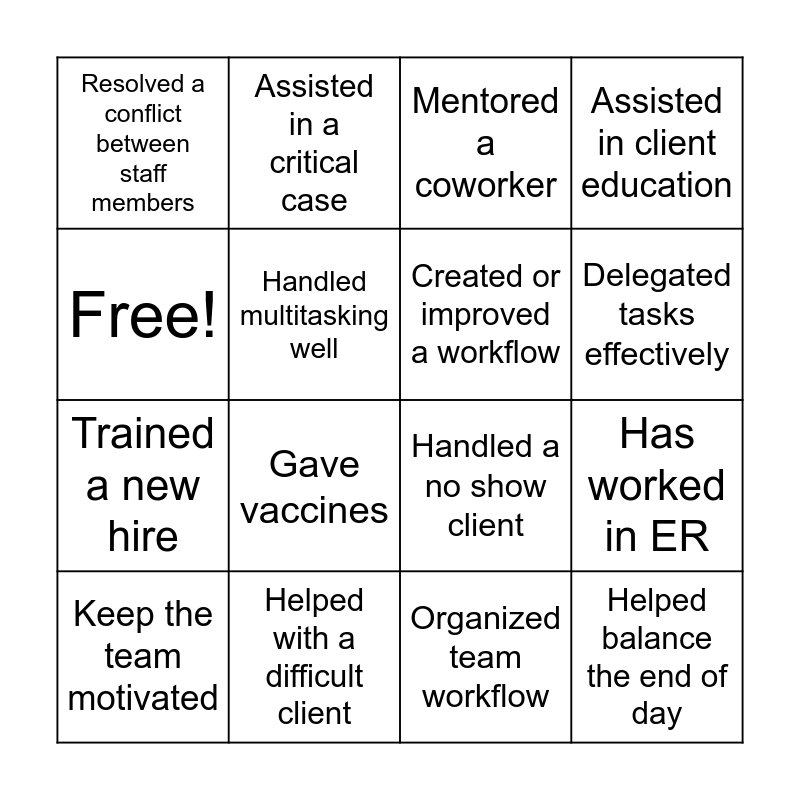 This bingo card has 16 words: Helped with a difficult client, Has worked in ER, Mentored a coworker, Resolved a conflict between staff members, Trained a new hire, Assisted in a critical case, Handled a no show client, Organized team workflow, Free!, Handled multitasking well, Keep the team motivated, Assisted in client education, Gave vaccines, Delegated tasks effectively, Created or improved a workflow and Helped balance the end of day.