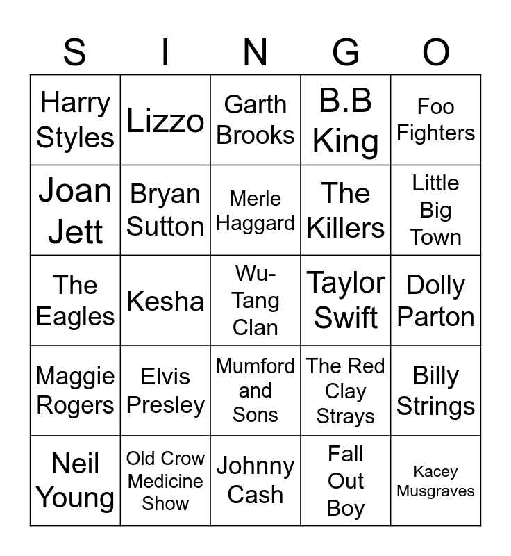 This bingo card has a free space and 25 words: Elvis Presley, Johnny Cash, Merle Haggard, Neil Young, Foo Fighters, Harry Styles, Joan Jett, Lizzo, Taylor Swift, Mumford and Sons, The Killers, The Eagles, The Red Clay Strays, Billy Strings, Bryan Sutton, Glen Cambell, Dolly Parton, Garth Brooks, Little Big Town, Kesha, Kacey Musgraves, Old Crow Medicine Show, Maggie Rogers, B.B King and Fall Out Boy.
