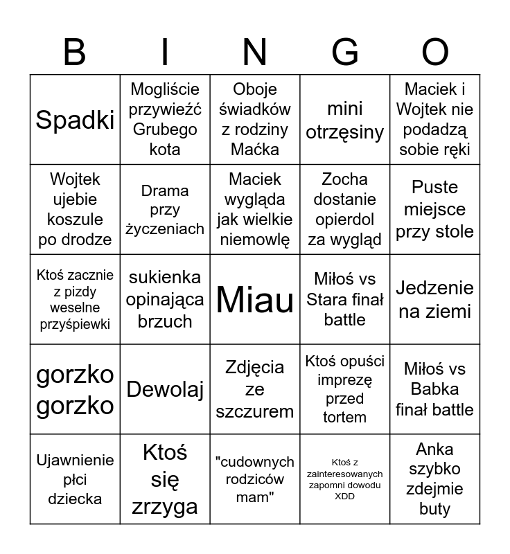 This bingo card has a free space and 24 words: Dewolaj, Ktoś się zrzyga, Maciek wygląda jak wielkie niemowlę, Ujawnienie płci dziecka, Maciek i Wojtek nie podadzą sobie ręki, Spadki, Wojtek ujebie koszule po drodze, Mogliście przywieźć Grubego kota, Miłoś vs Stara finał battle, Zdjęcia ze szczurem, Zocha dostanie opierdol za wygląd, Ktoś zacznie z pizdy weselne przyśpiewki, Ktoś opuści imprezę przed tortem, Miłoś vs Babka finał battle, Drama przy życzeniach, Ktoś z zainteresowanych zapomni dowodu XDD, Jedzenie na ziemi, Oboje świadków z rodziny Maćka, Puste miejsce przy stole, sukienka opinająca brzuch, Anka szybko zdejmie buty, gorzko gorzko, mini otrzęsiny and "cudownych rodziców mam".