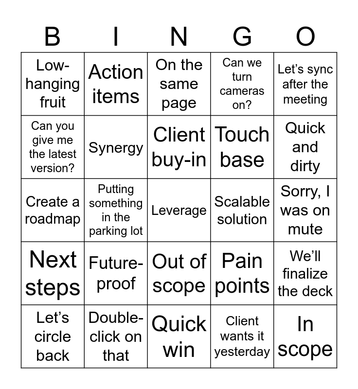 This bingo card has 57 words: Let’s keep it high level, Let’s circle back, Let’s take this offline, Low-hanging fruit, Quick win, Boil the ocean, Synergy, Bandwidth, Touch base, Deep dive, Can we turn cameras on?, Game changer, Best practice, Stakeholder alignment, Actionable insights, Can you share your screen?, Let’s sync after the meeting, Putting something in the parking lot, Timeline is tight but doable, Leverage, Scalable solution, End-to-end process, Pain points, On the same page, Think outside the box, Client buy-in, Deliverables, This slide needs polishing, Quick and dirty, Blue-sky thinking, A quick touchpoint, Let’s prioritize, Granular level, Elevator pitch, Sorry, I was on mute, Can you give me the latest version?, We need to refine the storyline, Create a roadmap, Critical path, Next steps, Action items, Out of scope, In scope, Critical workstream, Alignment meeting, Strategic priorities, Future-proof, Double-click on that, Let’s unpack this, We need to validate the numbers, Can we quantify this?Transformation journey, Client wants it yesterday, Client is pushing back, I’ll check with the client, We need to manage expectations, We’ll finalize the deck and We’re in good shape.