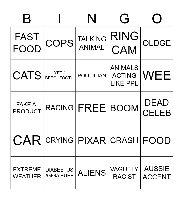 This bingo card has a free space and 24 words: CRYING, DIABEETUS /GIGA BUFF, POLITICIAN, EXTREME WEATHER, OLDGE, FAST FOOD, CATS, COPS, BOOM, PIXAR, ANIMALS ACTING LIKE PPL, FAKE AI PRODUCT, CRASH, FOOD, YETI/ BEEGUFOOTU, VAGUELY RACIST, DEAD CELEB, TALKING ANIMAL, WEE, RACING, AUSSIE ACCENT, CAR, RING CAM and ALIENS.