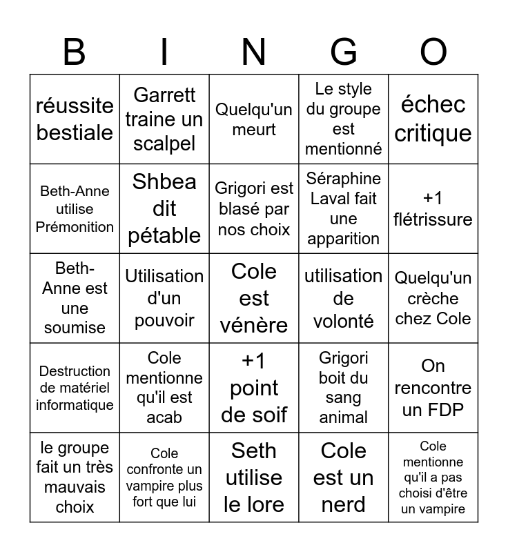 This bingo card has a free space and 24 words: Cole mentionne qu'il est acab, Cole confronte un vampire plus fort que lui, Grigori est blasé par nos choix, le groupe fait un très mauvais choix, échec critique, réussite bestiale, Beth-Anne utilise Prémonition, Garrett traine un scalpel, utilisation de volonté, +1 point de soif, Séraphine Laval fait une apparition, Beth-Anne est une soumise, Grigori boit du sang animal, On rencontre un FDP, Shbea dit pétable, Cole est un nerd, Quelqu'un crèche chez Cole, Quelqu'un meurt, +1 flétrissure, Utilisation d'un pouvoir, Cole mentionne qu'il a pas choisi d'être un vampire, Destruction de matériel informatique, Le style du groupe est mentionné and Seth utilise le lore.