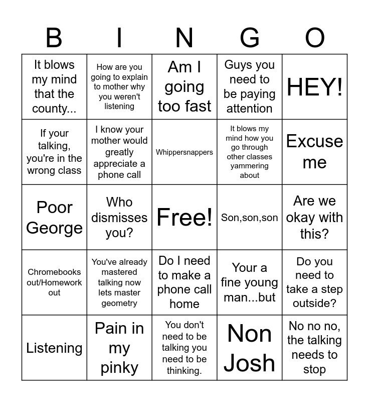 This bingo card has a free space and 24 words: You've already mastered talking now lets master geometry, Pain in my pinky, Whippersnappers, Listening, HEY!, It blows my mind that the county..., If your talking, you're in the wrong class, How are you going to explain to mother why you weren't listening, Son,son,son, Do I need to make a phone call home, It blows my mind how you go through other classes yammering about, Poor George, Your a fine young man...but, Do you need to take a step outside?, I know your mother would greatly appreciate a phone call, Non Josh, Are we okay with this?, Am I going too fast, Excuse me, Who dismisses you?, No no no, the talking needs to stop, Chromebooks out/Homework out, Guys you need to be paying attention and You don't need to be talking you need to be thinking..