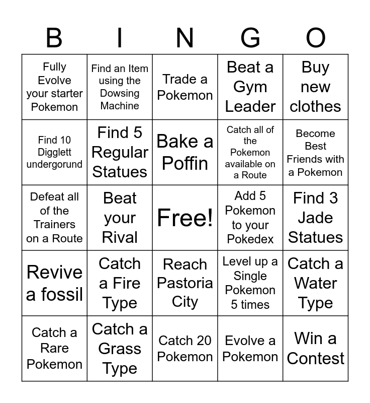 This bingo card has a free space and 24 words: Catch a Rare Pokemon, Catch a Fire Type, Bake a Poffin, Evolve a Pokemon, Buy new clothes, Fully Evolve your starter Pokemon, Find an Item using the Dowsing Machine, Trade a Pokemon, Add 5 Pokemon to your Pokedex, Find 3 Jade Statues, Defeat all of the Trainers on a Route, Find 5 Regular Statues, Level up a Single Pokemon 5 times, Catch a Water Type, Find 10 Digglett undergorund, Catch a Grass Type, Catch 20 Pokemon, Beat a Gym Leader, Become Best Friends with a Pokemon, Revive a fossil, Beat your Rival, Reach Pastoria City, Catch all of the Pokemon available on a Route and Win a Contest.
