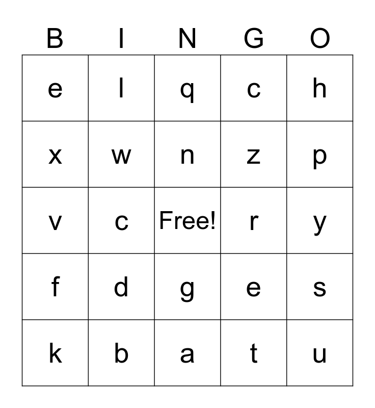 This bingo card has a free space and 31 words: a, b, c, d, e, q, w, e, r, t, y, u, i, o, p, a, s, d, f, g, h, j, k, l, z, x, c, v, b, n and m.