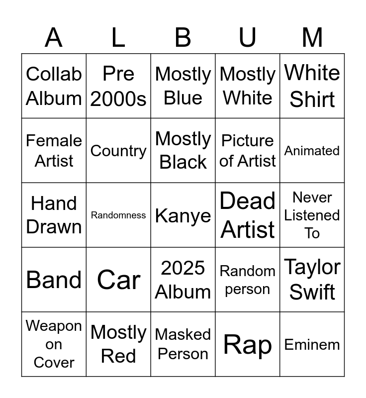 This bingo card has a free space and 24 words: Car, Mostly Red, Mostly Black, Weapon on Cover, White Shirt, Collab Album, Female Artist, Pre 2000s, Dead Artist, 2025 Album, Picture of Artist, Hand Drawn, Random person, Taylor Swift, Country, Rap, Never Listened To, Mostly Blue, Animated, Randomness, Eminem, Band, Mostly White and Masked Person.