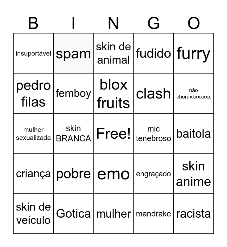 This bingo card has a free space and 24 words: pobre, Gotica, blox fruits, skin de veiculo, furry, insuportável, pedro filas, spam, mic tenebroso, emo, clash, mulher sexualizada, engraçado, skin anime, femboy, mandrake, baitola, skin de animal, não choraxxxxxxxx, skin BRANCA, racista, criança, fudido and mulher.