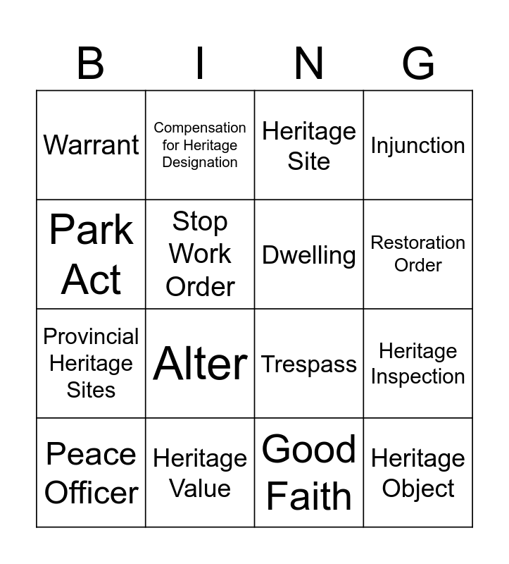 This bingo card has 20 words: Heritage Inspection, Conservation, Heritage Site, Amend, Suspend, or Cancel, Peace Officer, Park Act, Heritage Value, Warrant, Provincial Heritage Sites, Compensation for Heritage Designation, Alter, Trespass, Stop Work Order, Heritage Object, Dwelling, Offences and Penalties, Restoration Order, Injunction, Good Faith and Prosecute.