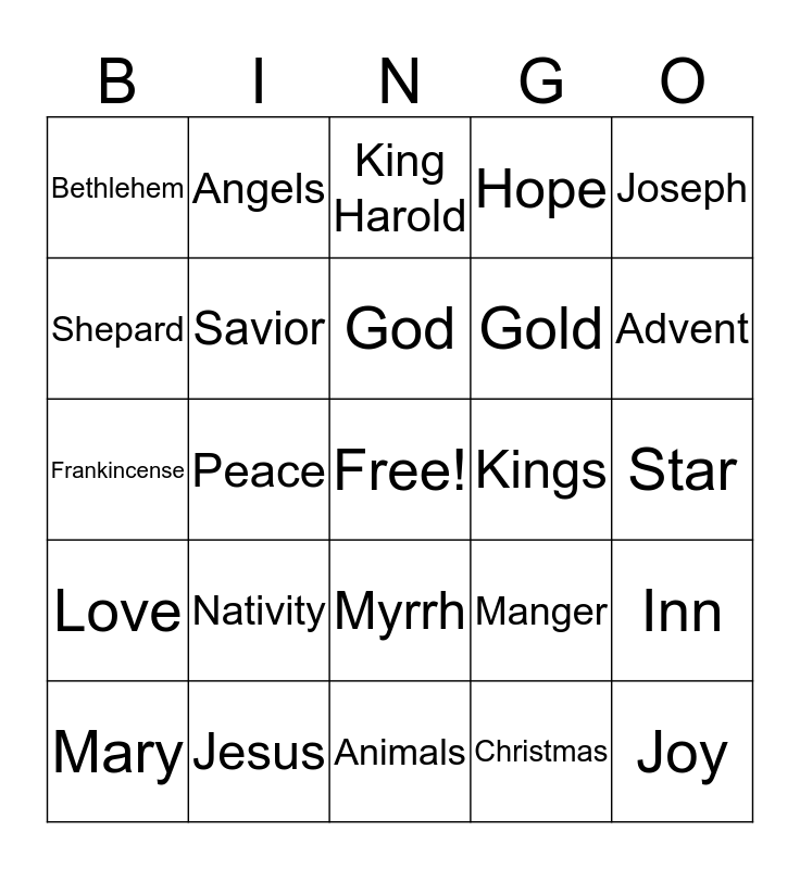 This bingo card has a free space and 24 words: Nativity, Jesus, God, Mary, Joseph, Bethlehem, Shepard, Angels, Kings, Myrrh, Gold, Frankincense, Manger, Inn, Savior, Christmas, Star, King Harold, Advent, Peace, Joy, Love, Hope and Animals.