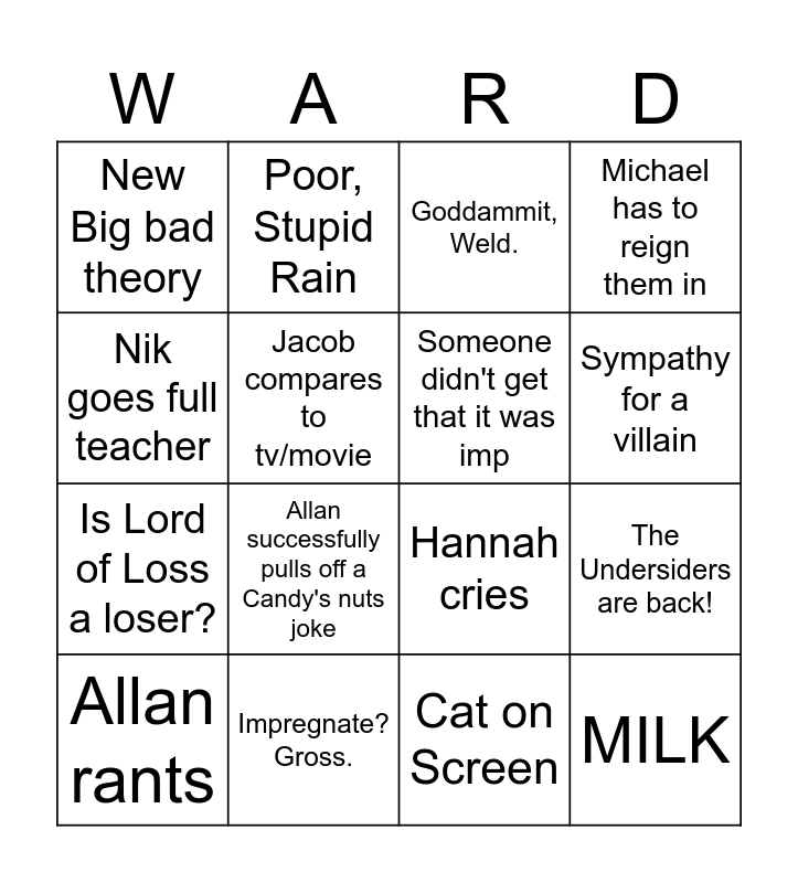 This bingo card has 16 words: Impregnate? Gross., The Undersiders are back!, Goddammit, Weld., New Big bad theory, Is Lord of Loss a loser?, Poor, Stupid Rain, Hannah cries, Cat on Screen, Nik goes full teacher, Jacob compares to tv/movie, Allan rants, Michael has to reign them in, Allan successfully pulls off a Candy's nuts joke, Sympathy for a villain, Someone didn't get that it was imp and MILK.