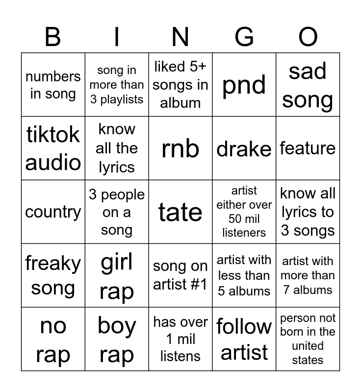 This bingo card has a free space and 24 words: girl rap, boy rap, rnb, no rap, sad song, numbers in song, tiktok audio, song in more than 3 playlists, artist either over 50 mil listeners, song on artist #1, drake, country, artist with less than 5 albums, artist with more than 7 albums, know all the lyrics, follow artist, know all lyrics to 3 songs, liked 5+ songs in album, feature, 3 people on a song, person not born in the united states, freaky song, pnd and has over 1 mil listens.