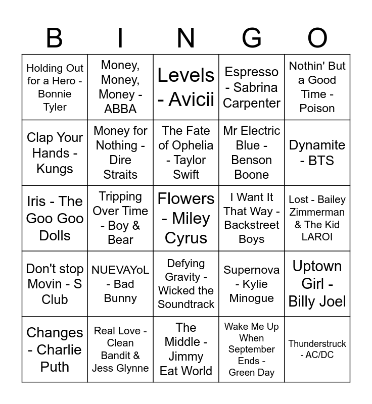 This bingo card has 25 words: Don't stop Movin - S Club, Real Love - Clean Bandit & Jess Glynne, Flowers - Miley Cyrus, Wake Me Up When September Ends - Green Day, Nothin' But a Good Time - Poison, Holding Out for a Hero - Bonnie Tyler, Money, Money, Money - ABBA, Levels - Avicii, I Want It That Way - Backstreet Boys, Uptown Girl - Billy Joel, Clap Your Hands - Kungs, Money for Nothing - Dire Straits, The Middle - Jimmy Eat World, Supernova - Kylie Minogue, Dynamite - BTS, Changes - Charlie Puth, Tripping Over Time - Boy & Bear, The Fate of Ophelia - Taylor Swift, Mr Electric Blue - Benson Boone, Lost - Bailey Zimmerman & The Kid LAROI, Iris - The Goo Goo Dolls, NUEVAYoL - Bad Bunny, Defying Gravity - Wicked the Soundtrack, Espresso - Sabrina Carpenter and Thunderstruck - AC/DC.