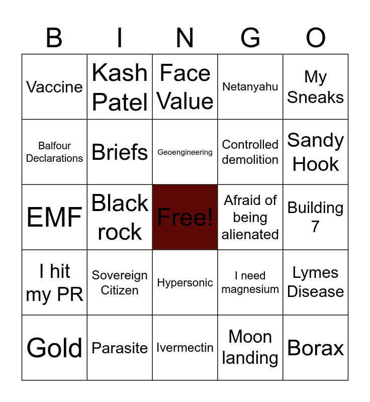 This bingo card has a free space and 24 words: Sovereign Citizen, Parasite, Geoengineering, Gold, My Sneaks, Vaccine, Balfour Declarations, Kash Patel, Afraid of being alienated, Hypersonic, Controlled demolition, EMF, I need magnesium, Lymes Disease, Briefs, Moon landing, Building 7, Face Value, Sandy Hook, Black rock, Borax, I hit my PR, Netanyahu and Ivermectin.