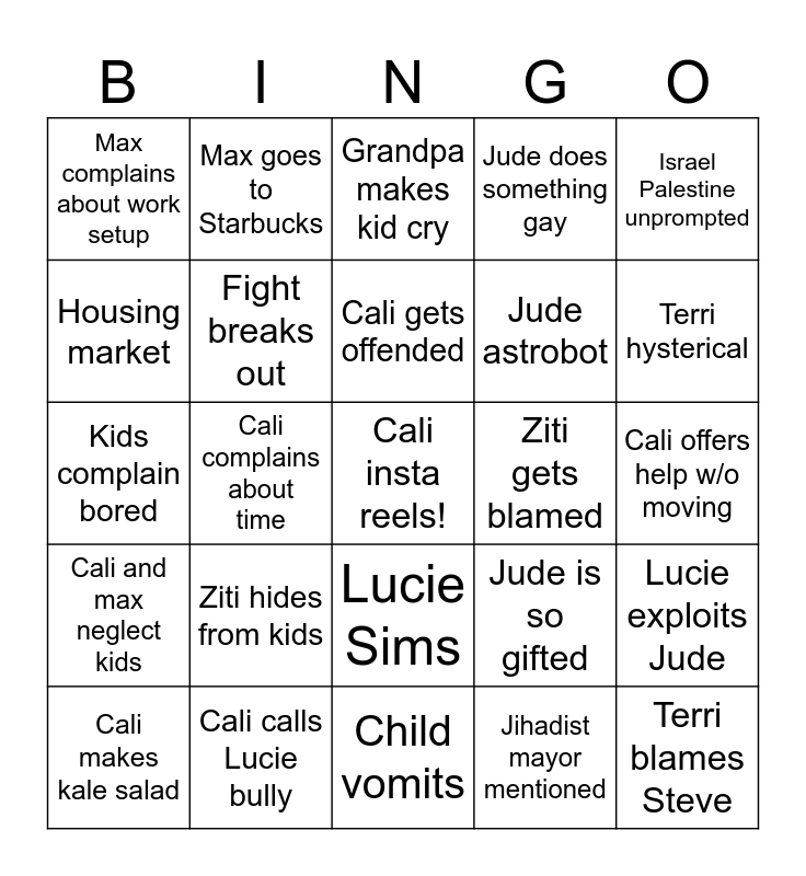 This bingo card has a free space and 24 words: Ziti hides from kids, Cali calls Lucie bully, Cali gets offended, Cali makes kale salad, Israel Palestine unprompted, Max complains about work setup, Housing market, Max goes to Starbucks, Ziti gets blamed, Lucie Sims, Jude astrobot, Kids complain bored, Jude is so gifted, Lucie exploits Jude, Fight breaks out, Jihadist mayor mentioned, Cali offers help w/o moving, Grandpa makes kid cry, Terri hysterical, Cali complains about time, Terri blames Steve, Cali and max neglect kids, Jude does something gay and Child vomits.