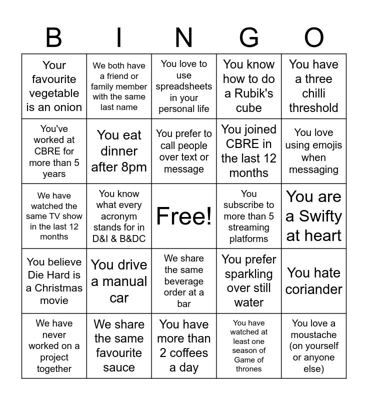 This bingo card has a free space and 24 words: You drive a manual car, We share the same favourite sauce, You prefer to call people over text or message, We have never worked on a project together, You have a three chilli threshold, Your favourite vegetable is an onion, You've worked at CBRE for more than 5 years, We both have a friend or family member with the same last name, You subscribe to more than 5 streaming platforms, We share the same beverage order at a bar, You joined CBRE in the last 12 months, We have watched the same TV show in the last 12 months, You prefer sparkling over still water, You hate coriander, You eat dinner after 8pm, You have watched at least one season of Game of thrones, You are a Swifty at heart, You love to use spreadsheets in your personal life, You love using emojis when messaging, You know what every acronym stands for in D&I & B&DC, You love a moustache (on yourself or anyone else), You believe Die Hard is a Christmas movie, You know how to do a Rubik's cube and You have more than 2 coffees a day.