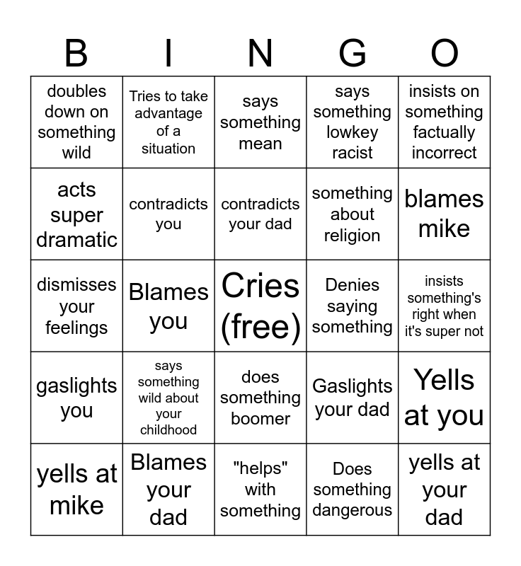 This bingo card has a free space and 24 words: says something wild about your childhood, Blames your dad, contradicts your dad, yells at mike, insists on something factually incorrect, doubles down on something wild, acts super dramatic, Tries to take advantage of a situation, Denies saying something, does something boomer, something about religion, dismisses your feelings, Gaslights your dad, Yells at you, contradicts you, Does something dangerous, insists something's right when it's super not, says something mean, blames mike, Blames you, yells at your dad, gaslights you, says something lowkey racist and "helps" with something.