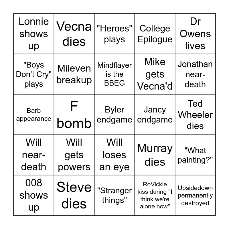 This bingo card has a free space and 24 words: Will gets powers, Steve dies, Mindflayer is the BBEG, 008 shows up, Dr Owens lives, Lonnie shows up, "Boys Don't Cry" plays, Vecna dies, Jancy endgame, Will loses an eye, Mike gets Vecna'd, Barb appearance, Murray dies, "What painting?", Mileven breakup, RoVickie kiss during "I think we're alone now", Ted Wheeler dies, "Heroes" plays, Jonathan near-death, F bomb, Upsidedown permanently destroyed, Will near-death, College Epilogue and "Stranger things".