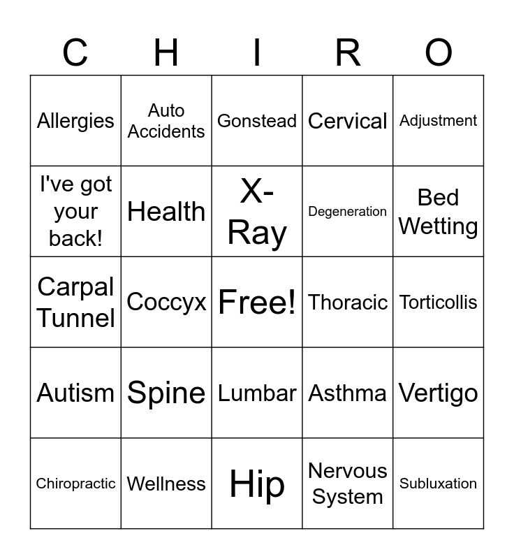 This bingo card has a free space and 45 words: Low Back, Subluxation, Vertebrae, Chiropractic, Pregnancy, Nervous System, Gonstead, Extremities, Adjustment, Wellness, Cervical, Thoracic, Lumbar, Spine, Headaches/Migraines, Hip, Neck, Carpal Tunnel, Colic, Bed Wetting, Auto Accidents, ADD/ADHD, Sciatica, Allergies, Sinus, Torticollis, Sacrum, Ear Infections, Asthma, Autism, Scoliosis, Vertigo, Whiplash, Sports Injuries, Palmer, Coccyx, Posture, Atlas, Palpation, X-Ray, I've got your back!, Degeneration, Arthritis, Health and Radiculopathy.