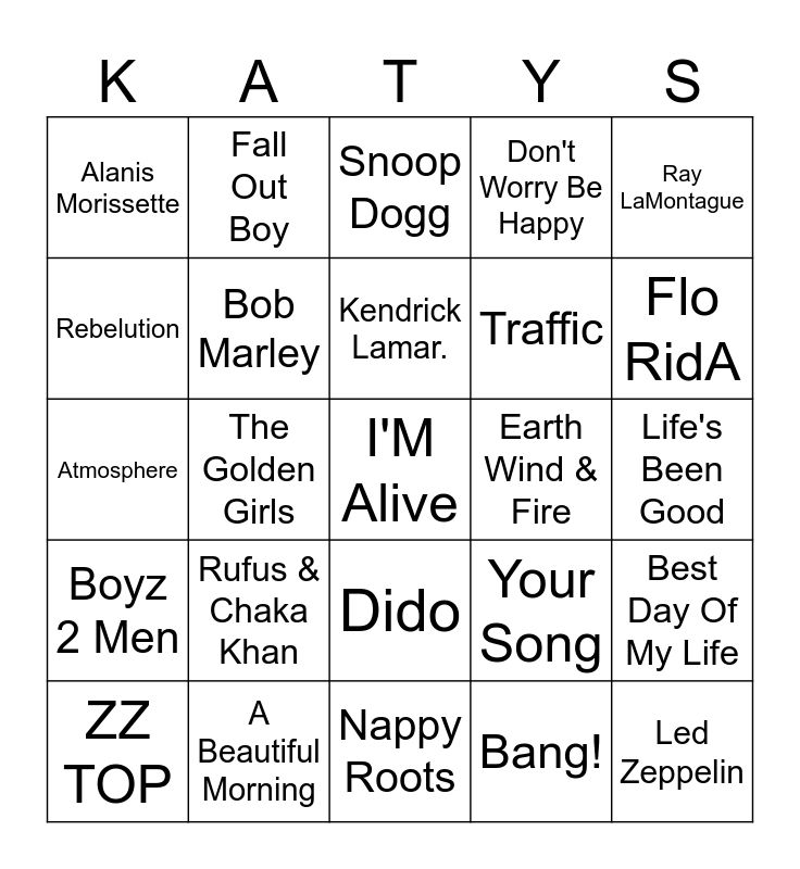 This bingo card has 29 words: ZZ TOP, Sly & The Family Stone, The Golden Girls, Led Zeppelin, Alanis Morissette, Snoop Dogg, Bob Marley, Rufus & Chaka Khan, Earth Wind & Fire, A Beautiful Morning, Life's Been Good, I'M Alive, Nappy Roots, Bang!, Flo RidA, Larger Than Life, Dido, Boyz 2 Men, Ray LaMontague, Atmosphere, Your Song, Lucky, Traffic, Rebelution, Don't Worry Be Happy, Fall Out Boy, Best Day Of My Life, Kendrick Lamar. and Good Lovin'.
