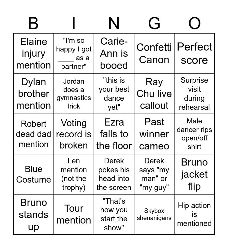 This bingo card has 27 words: Derek says "my man" or "my guy", Hip action is mentioned, Ray Chu live callout, "That's how you start the show", Dylan brother mention, Carie-Ann is booed, "I'm so happy I got ____ as a partner", Blue Costume, Past winner cameo, Bruno jacket flip, Robert dead dad mention, Confetti Canon, Bruno stands up, Tour mention, Surprise visit during rehearsal, "I'm not ready for it to be over/end", Jordan does a gymnastics trick, "this is your best dance yet", Len mention (not the trophy), Elaine injury mention, Male dancer rips open/off shirt, Skybox shenanigans, Voting record is broken, Ezra falls to the floor, Derek pokes his head into the screen, Perfect score and Bruno says "my darling".