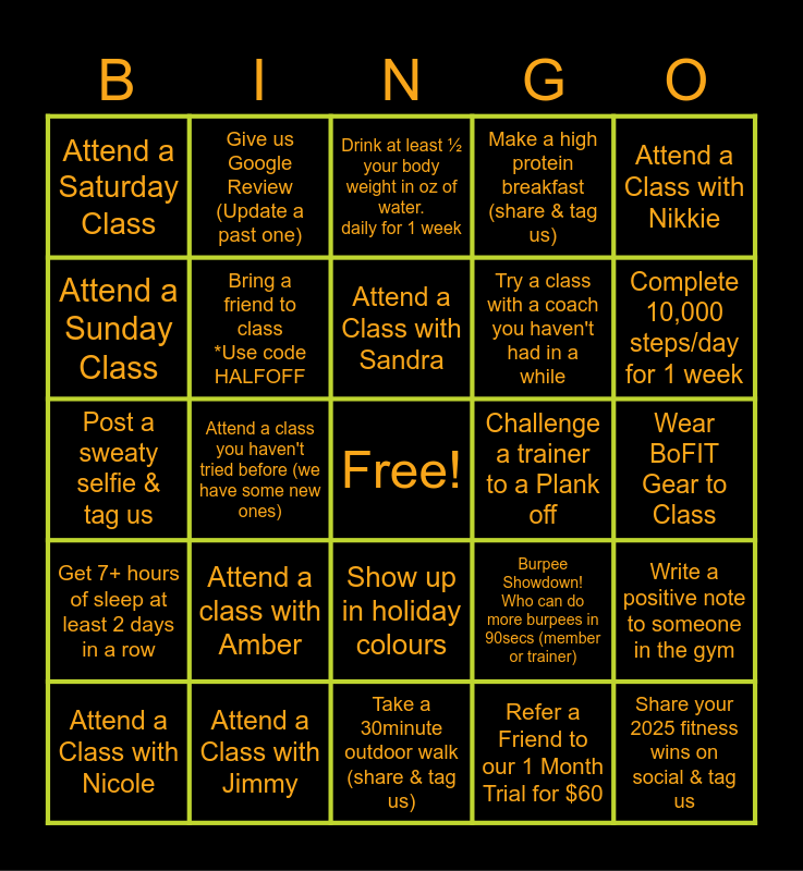 This bingo card has a free space and 24 words: Attend a class with Amber, Attend a Class with Jimmy, Attend a Class with Sandra, Attend a Class with Nicole, Attend a Class with Nikkie, Attend a Saturday Class, Attend a Sunday Class, Give us Google Review (Update a past one), Challenge a trainer to a Plank off, Show up in holiday colours, Try a class with a coach you haven't had in a while, Post a sweaty selfie & tag us, Burpee Showdown! Who can do more burpees in 90secs (member or trainer), Write a positive note to someone in the gym, Bring a friend to class *Use code HALFOFF, Refer a Friend to our 1 Month Trial for $60, Wear BoFIT Gear to Class, Drink at least ½ your body weight in oz of water. daily for 1 week, Complete 10,000 steps/day for 1 week, Attend a class you haven't tried before (we have some new ones), Share your 2025 fitness wins on social & tag us, Get 7+ hours of sleep at least 2 days in a row, Make a high protein breakfast (share & tag us) and Take a 30minute outdoor walk (share & tag us).