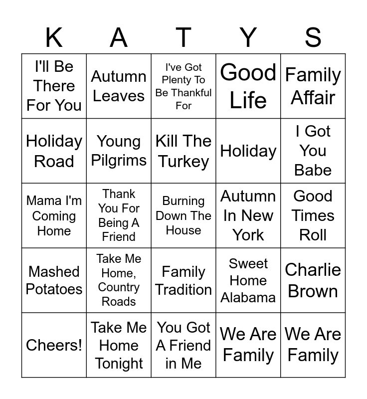 This bingo card has 32 words: We Are Family, The Thanksgiving Song, Thank You For Being A Friend, Macy's Day Parade, Mashed Potatoes, Young Pilgrims, Family Affair, Charlie Brown, Autumn Leaves, We Are Family, Kill The Turkey, I've Got Plenty To Be Thankful For, Going Up The Country, Home, Autumn In New York, Lean On Me, Cheers!, Mama I'm Coming Home, Family Tradition, Take Me Home, Country Roads, Sweet Home Alabama, Our House, Good Times Roll, Take Me Home Tonight, Burning Down The House, Good Life, Holiday, Holiday Road, I'll Be There For You, You Got A Friend in Me, With A Little Help From My Friends and I Got You Babe.