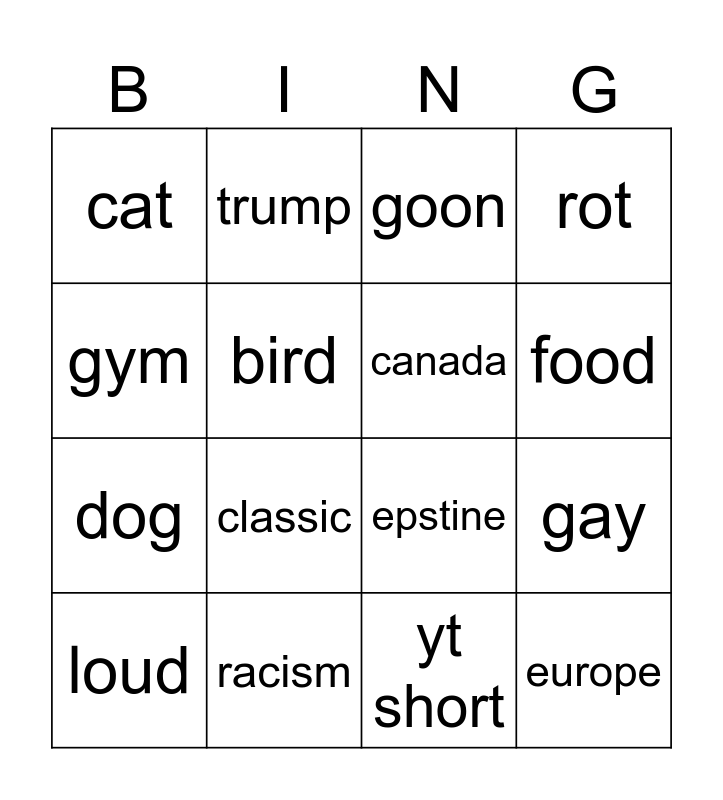 This bingo card has 16 words: racism, gay, goon, cat, dog, trump, epstine, yt short, gym, bird, loud, rot, classic, food, canada and europe.