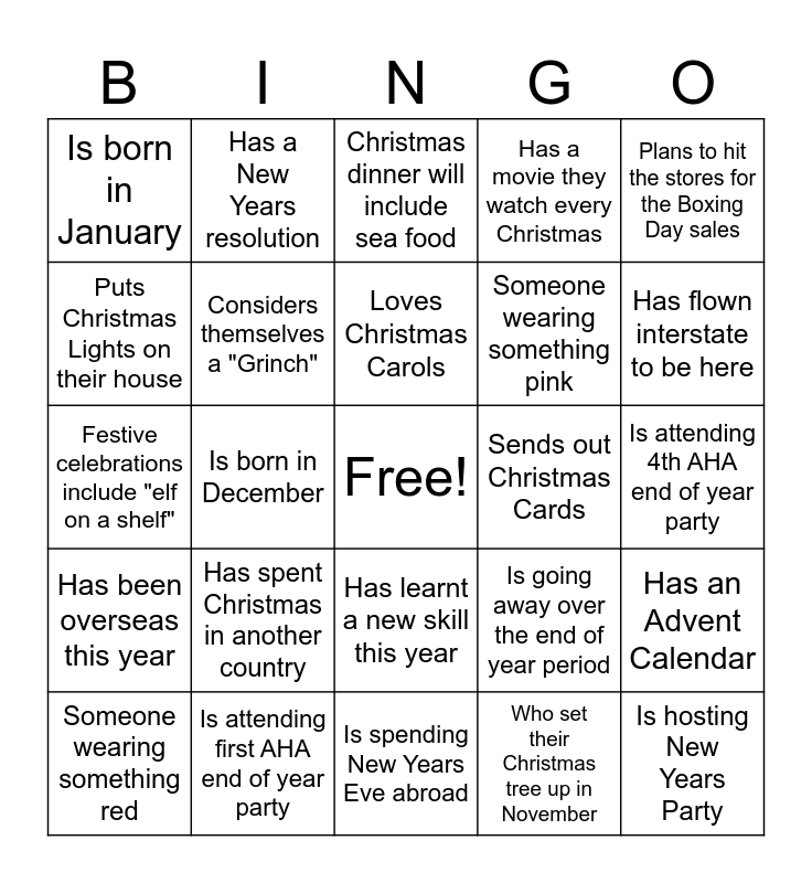 This bingo card has a free space and 46 words: Has already completed their Christmas Shopping, Is hosting New Years Party, Has their Christmas tree set up, Is spending New Years Eve abroad, Has spent Christmas in another country, Has a holiday scheduled for the New Year, Has a New Years resolution, Likes to bake over the festive season, Puts Christmas Lights on their house, Has a family tradition for the festive season, Considers themselves a "Grinch", Has a movie they watch every Christmas, Has an Advent Calendar, Is going away over the end of year period, Plans on being alseep by 9pm on New Years Eve, Plans on staying up until midnight on New Years Eve, Loves Christmas Carols, Sends out Christmas Cards, Will be watching the Boxing Day test match, Plans to hit the stores for the Boxing Day sales, Is born in December, Who set their Christmas tree up in November, Is born in January, Someone wearing something pink, Someone wearing a bird hat, Has flown interstate to be here, Someone wearing something red, Has taken a Santa photo this year, Has learnt a new skill this year, Has been overseas this year, Has something they are proud of achieving in 2025, Who you have never met before, Shares the same birthday month as you, Is going to a festival, concert or event over the festive season, Has stuck to a New Years Resolution they set this year., Is attending first AHA end of year party, Is attending 4th AHA end of year party, Does not celebrate Christmas, Plans on including karaoke as part of Festive celebrations, Knows the ingredients of egg nogg, exchanges gifts Christmas eve, Christmas dinner will include sea food, Festive celebrations include "elf on a shelf", Has more than 3 children to purchase gifts for, Likes to eat Christmas pudding and Leaves out milk and cookies for Santa.
