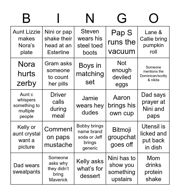 This bingo card has 25 words: Comment on paps mustache, Kelly asks what’s for dessert, Boys in matching set, Dad wears sweatpants, Lane & Callie bring pumpkin roll, Aunt Lizzie makes Nora’s plate, Nora hurts zerby, Nini or pap shake their head at an Esterline, Aaron brings his own cup, Bobby brings name brand soda or Jeff brings generic, Not enough deviled eggs, Aunt c whispers something to multiple people, Bitmoji groupchat goes off, Utensil is licked and put back in dish, Gram asks someone to count her pills, Mom drinks protein shake, Dad says prayer at Nini and paps, Steven wears his steel toed boots, Someone mentions the Dominican/scotty & nikita, Driver calls during meal, Jamie wears hey dudes, Someone asks why they didn’t bring Maverick, Kelly or aunt crystal want a picture, Pap S runs the vacuum and Nini has to show you something upstairs.