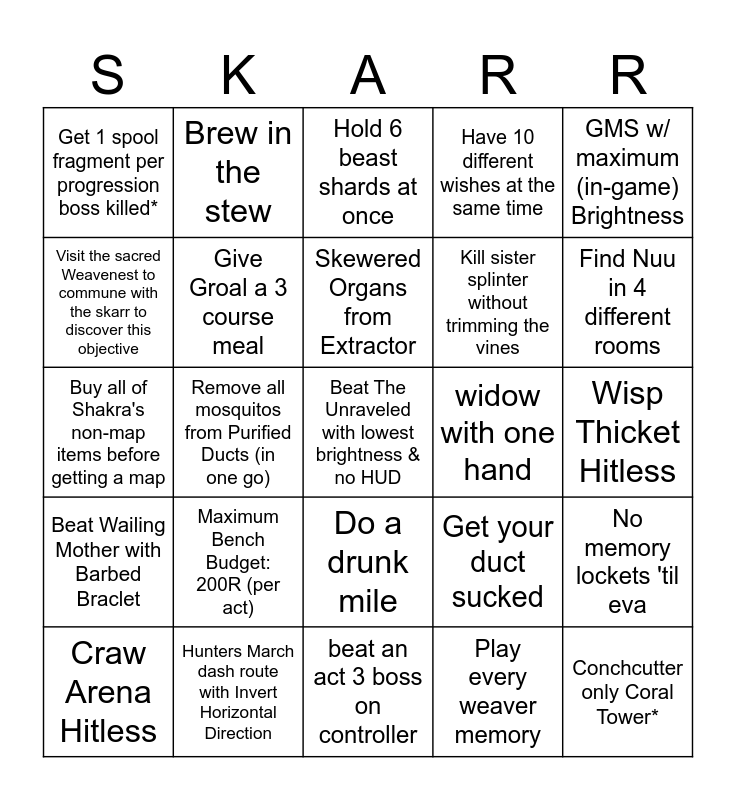 This bingo card has a free space and 24 words: Maximum Bench Budget: 200R (per act), Hunters March dash route with Invert Horizontal Direction, Skewered Organs from Extractor, Craw Arena Hitless, GMS w/ maximum (in-game) Brightness, Get 1 spool fragment per progression boss killed*, Visit the sacred Weavenest to commune with the skarr to discover this objective, Brew in the stew, widow with one hand, Do a drunk mile, Kill sister splinter without trimming the vines, Buy all of Shakra's non-map items before getting a map, Get your duct sucked, No memory lockets 'til eva, Give Groal a 3 course meal, Play every weaver memory, Wisp Thicket Hitless, Hold 6 beast shards at once, Find Nuu in 4 different rooms, Remove all mosquitos from Purified Ducts (in one go), Conchcutter only Coral Tower*, Beat Wailing Mother with Barbed Braclet, Have 10 different wishes at the same time and beat an act 3 boss on controller.