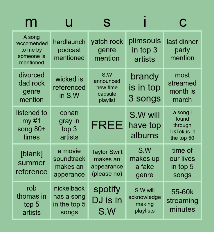 This bingo card has a free space and 24 words: a movie soundtrack makes an apperance, nickelback has a song in the top 5 songs, S.W announced new time capsule playlist, rob thomas in top 5 artists, last dinner party mention, A song reccomended to me by someone is mentioned, divorced dad rock genre mention, hardlaunch podcast mentioned, S.W will have top albums, Taylor Swift makes an appearance (please no), brandy is in top 3 songs, listened to my #1 song 80+ times, S.W makes up a fake genre, time of our lives in top 5 songs, wicked is referenced in S.W, S.W will acknowledge making playlists, a song i found through TikTok is in the top 50, yatch rock genre mention, most streamed month is march, conan gray in top 3 artists, 55-60k streaming minutes, [blank] summer reference, plimsouls in top 3 artists and spotify DJ is in S.W.