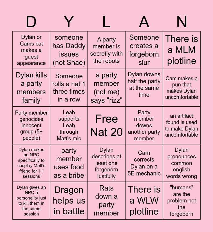 This bingo card has a free space and 24 words: party member uses food as a bribe, Dragon helps us in battle, a party member (not me) says "rizz", Dylan gives an NPC a personality just to kill them in the same session, There is a MLM plotline, Dylan or Cams cat makes a guest appearance, Dylan kills a party members family, someone has Daddy issues (not Shae), Party member downs another party member, Dylan describes at least one forgeborn lustfully, Dylan downs half the party at the same time, Party member genocides innocent group (5+ people), Cam corrects Dylan on a 5E mechanic, Dylan pronounces common english words wrong, Someone rolls a nat 1 three times in a row, There is a WLW plotline, an artifact found is used to make Dylan uncomfortable, A party member is secretly with the robots, Cam makes a pun that makes Dylan uncomfortable, Leah supports Leah through Matt's mic, "humans" are the problem not the forgeborn, Dylan makes an NPC specifically to cosplay Matt's friend for 1+ sessions, Someone creates a forgeborn slur and Rats down a party member.