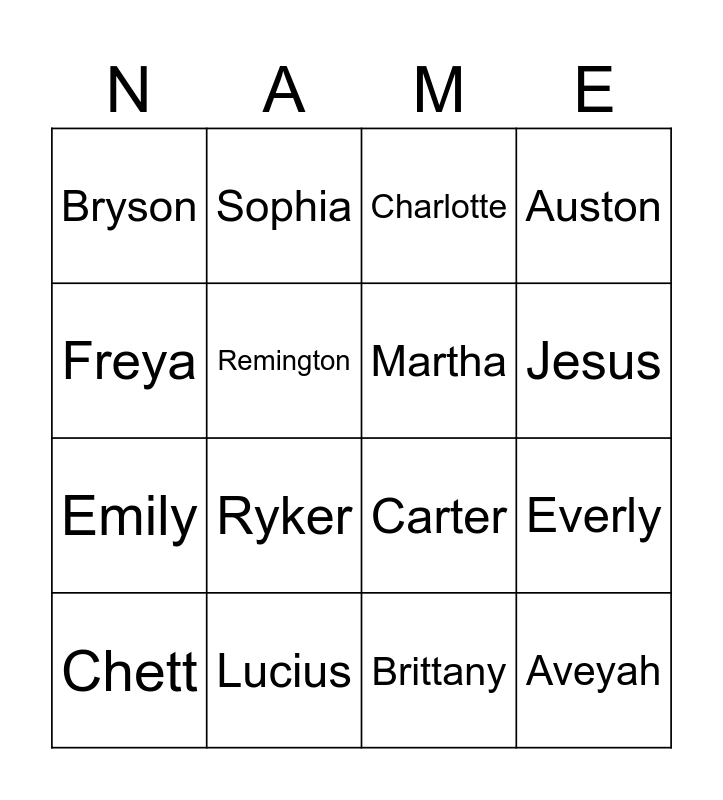 This bingo card has 20 words: Everly, Odin, Charlotte, Calypso, Chett, Freya, Lucius, Bryson, Emily, Sophia, Ryker, Carter, Remington, Aveyah, Martha, Olivia, Jesus, Auston, Brittany and Veronica.
