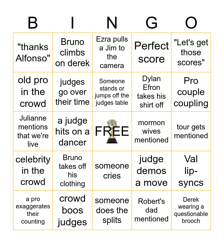 This bingo card has a free space and 24 words: Bruno takes off his clothing, crowd boos judges, Someone stands or jumps off the judges table, a pro exaggerates their counting, "Let's get those scores", "thanks Alfonso", old pro in the crowd, Bruno climbs on derek, mormon wives mentioned, someone cries, Dylan Efron takes his shirt off, Julianne mentions that we're live, judge demos a move, Val lip-syncs, judges go over their time, Robert's dad mentioned, tour gets mentioned, Ezra pulls a Jim to the camera, Pro couple coupling, a judge hits on a dancer, Derek wearing a questionable brooch, celebrity in the crowd, Perfect score and someone does the splits.