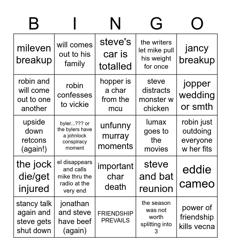 This bingo card has a free space and 24 words: el disappears and calls mike thru the radio at the very end, jonathan and steve have beef (again), hopper is a char from the mcu, stancy talk again and steve gets shut down, jancy breakup, mileven breakup, robin and will come out to one another, will comes out to his family, lumax goes to the movies, important char death, steve distracts monster w chicken, upside down retcons (again!), steve and bat reunion, eddie cameo, robin confesses to vickie, the season was not worth splitting into 3, robin just outdoing everyone w her fits, steve's car is totalled, jopper wedding or smth, byler...??? or the bylers have a johnlock conspiracy moment, power of friendship kills vecna, the jock die/get injured, the writers let mike pull his weight for once and FRIENDSHIP PREVAILS.