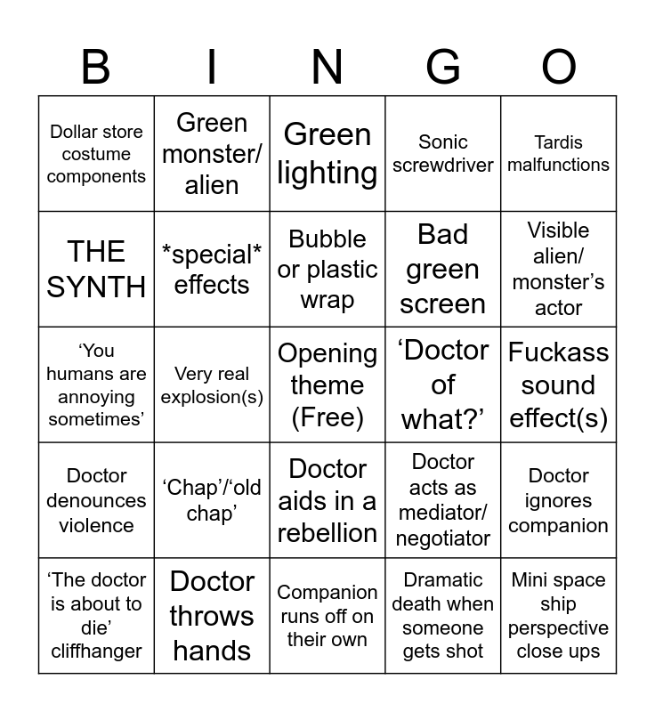 This bingo card has a free space and 24 words: ‘Chap’/‘old chap’, Doctor throws hands, Bubble or plastic wrap, ‘The doctor is about to die’ cliffhanger, Tardis malfunctions, Dollar store costume components, THE SYNTH, Green monster/ alien, ‘Doctor of what?’, Doctor aids in a rebellion, Bad green screen, ‘You humans are annoying sometimes’, Doctor acts as mediator/ negotiator, Doctor ignores companion, *special* effects, Dramatic death when someone gets shot, Fuckass sound effect(s), Green lighting, Visible alien/ monster’s actor, Very real explosion(s), Mini space ship perspective close ups, Doctor denounces violence, Sonic screwdriver and Companion runs off on their own.