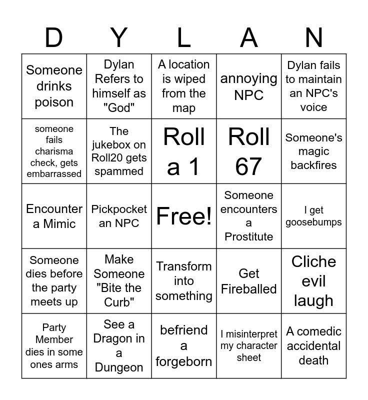 This bingo card has a free space and 24 words: Make Someone "Bite the Curb", See a Dragon in a Dungeon, Roll a 1, Party Member dies in some ones arms, Dylan fails to maintain an NPC's voice, Someone drinks poison, someone fails charisma check, gets embarrassed, Dylan Refers to himself as "God", Someone encounters a Prostitute, Transform into something, Roll 67, Encounter a Mimic, Get Fireballed, Cliche evil laugh, The jukebox on Roll20 gets spammed, I misinterpret my character sheet, I get goosebumps, A location is wiped from the map, Someone's magic backfires, Pickpocket an NPC, A comedic accidental death, Someone dies before the party meets up, annoying NPC and befriend a forgeborn.